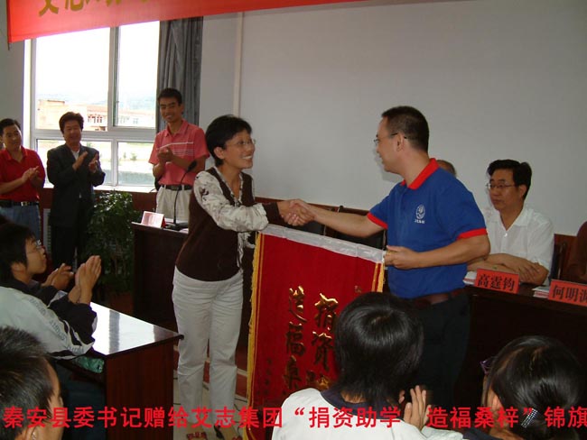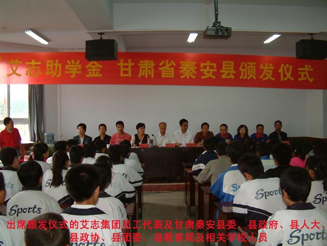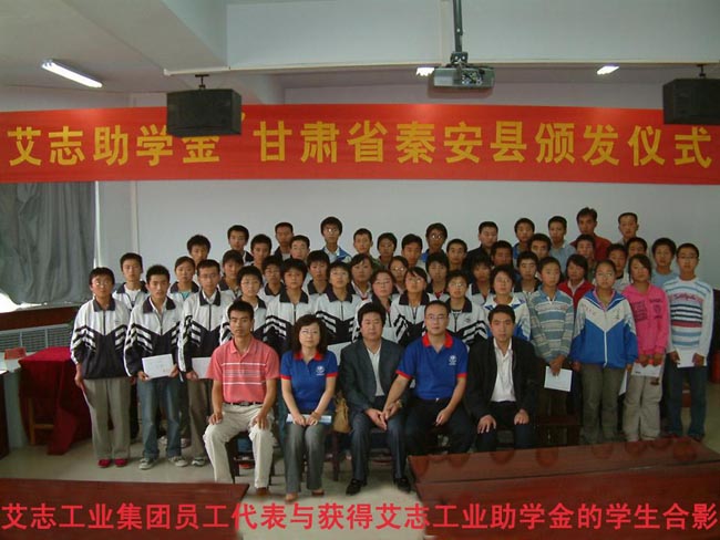 2008年8月29日上午十點,艾志工業(yè)技術(shù)集團有限公司代表與甘肅秦安縣第五中學共牽手,舉行了第一期“艾志工業(yè)助學金”甘肅秦安頒發(fā)儀式,艾志工業(yè)技術(shù)集團有限公司這一長期助學協(xié)議的第一次頒發(fā)儀式得到了當?shù)卣跋嚓P(guān)部門的高度重視,在活動現(xiàn)場甘肅秦安縣委、縣政府、縣政協(xié)、縣人大、縣團委和教育局相關(guān)部門都派領(lǐng)導出席了第一期“艾志工業(yè)助學金”頒發(fā)儀式。艾志工業(yè)技術(shù)集團有限公司員工捐贈代表張小軍、陳曼莉、黃國輝現(xiàn)場參加了儀式并對學生頒發(fā)了第一期助學金。