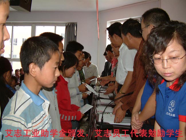 自5.12汶川大地震后,四川省和甘肅省貧困學生群體,不僅面臨著地震對他們心靈上的摧殘,同時更面臨著還能不能回到學校上學的困難?!鞍竟I(yè)助學金”致力于幫助四川省和甘肅省品學兼優(yōu)的貧困學生能重返校園安心讀書。通過授予“艾志工業(yè)助學金”的形式給予孩子們經(jīng)濟上的支持。