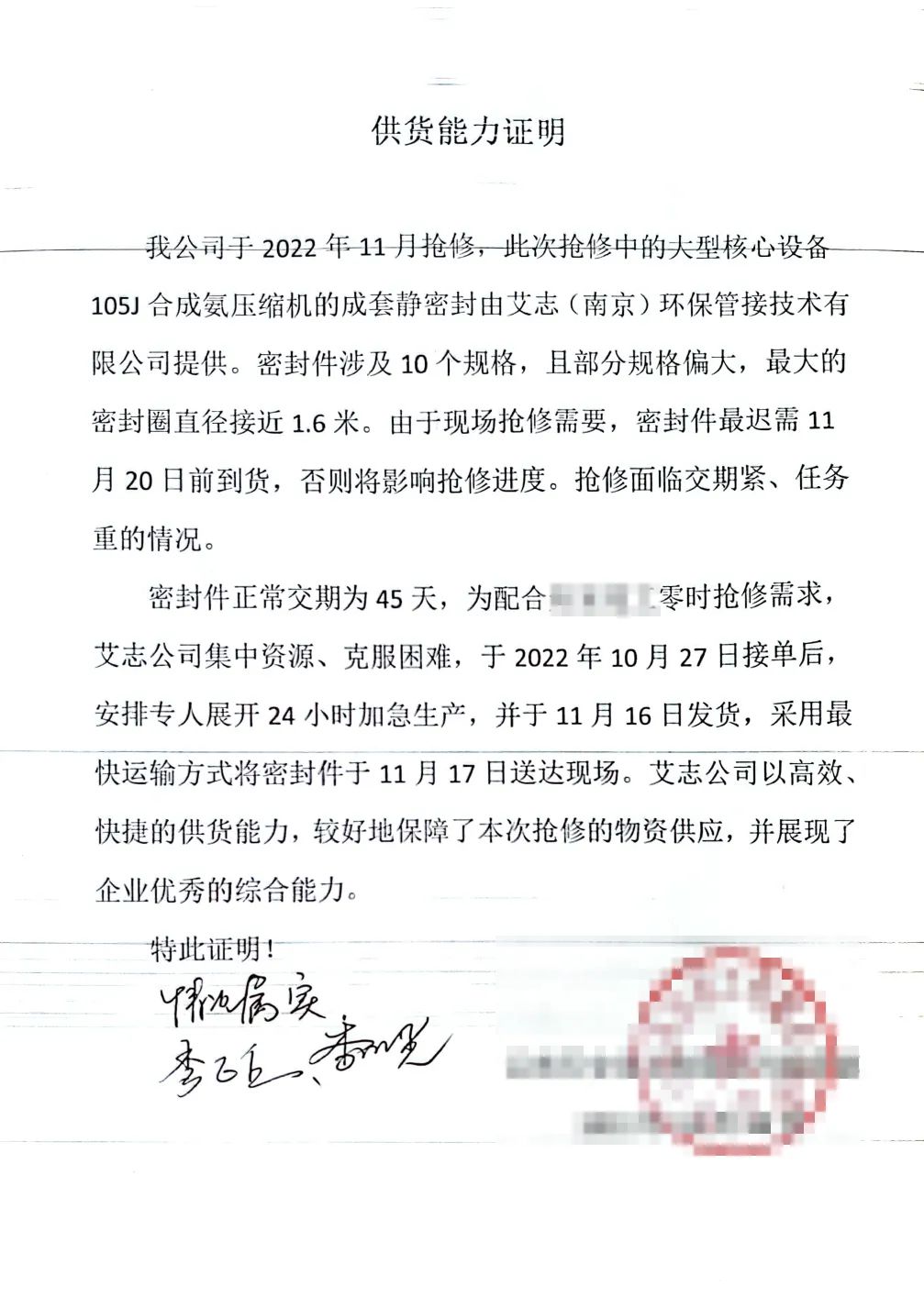 鑒于密封件的規(guī)格偏大,材質多樣化,本批合成氨壓縮機成套靜密封件原計劃供貨周期為45天,經公司各部門的協(xié)同努力,最終將實際交貨期縮短為20天。截至發(fā)稿日,該企業(yè)此次搶修任務已完成,已正常開機復產,艾志密封工作正常,無一泄漏。