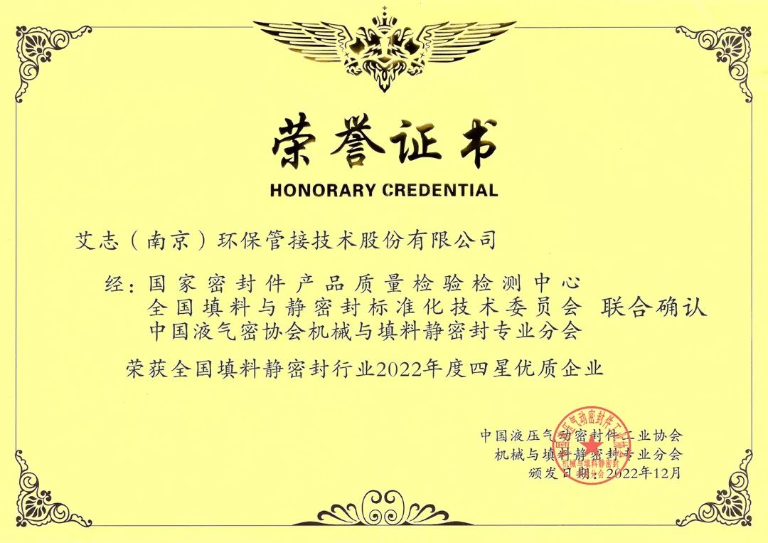 憑著公司金屬墊片、非金屬墊片、復合增強墊片、模壓填料、編織填料等等產品的精湛質量、良好的用戶聲譽以及相關生產活動的規(guī)范運營,經大會審查評議,授予我司 “全國填料靜密封行業(yè)2022年度四星優(yōu)質企業(yè)”稱號;??
