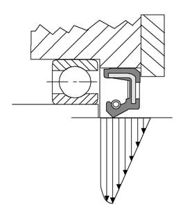 使用之前,油封的唇口內(nèi)徑比軸徑?。ㄐD(zhuǎn)孔用油封的唇口外徑比孔徑大),具有一定的過盈量。安裝后,油封由于唇口過盈和自緊彈簧(帶有彈簧的油封)的收縮會對旋轉(zhuǎn)軸產(chǎn)生一定的徑向壓力。同時,油封在彈簧收縮而產(chǎn)生的抱緊力作用下,能夠克服軸在旋轉(zhuǎn)狀態(tài)下因軸的振動、跳動所產(chǎn)生的間隙,使油封的唇口能夠緊貼在軸的表面上。工作時,油封唇口與旋轉(zhuǎn)軸表面形成一個密封接觸環(huán)帶。在密封腔內(nèi)油壓的作用下,潤滑油滲入油封唇口與旋轉(zhuǎn)軸之間形成極薄的一層油膜。油膜受油液表面張力的作用,在旋轉(zhuǎn)軸表面和油封唇口外沿之間形成一個“新月面”防止油液外溢,起到密封的作用;另一方面還可以起到油封唇口與軸表面之間的潤滑作用。